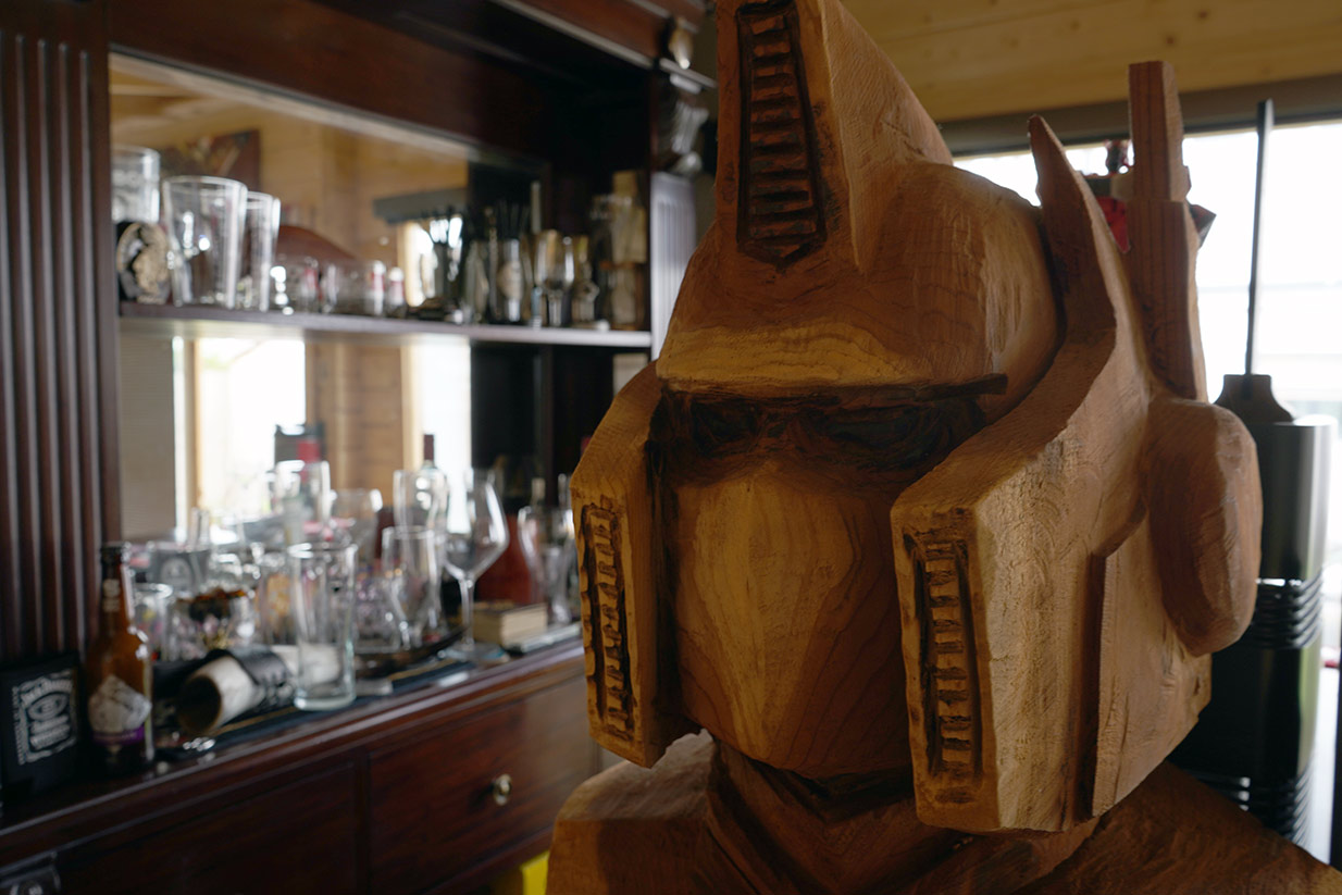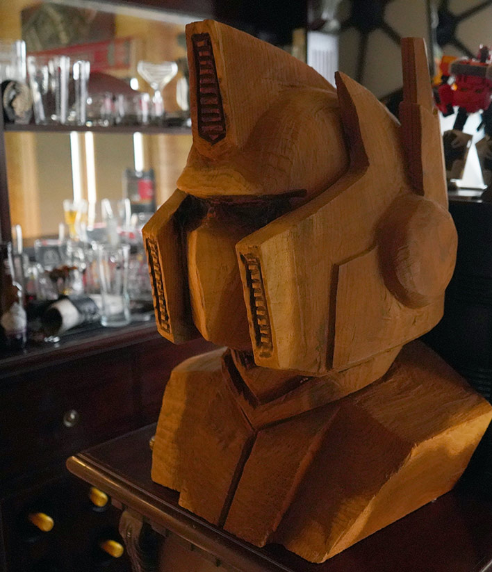 For Transformers fans, it isn’t just the name and pub sign that makes the bar a Transformers-themed pub. The bar also sports an Optimus Prime bust, carved by local chainsaw artist, and world-renowned tree carver, Simon O’Rourke. The bust, which is carved in the shape of the original Generation One Optimus Prime, is made from the tree as the lion from the Countess of Chester Hospital.